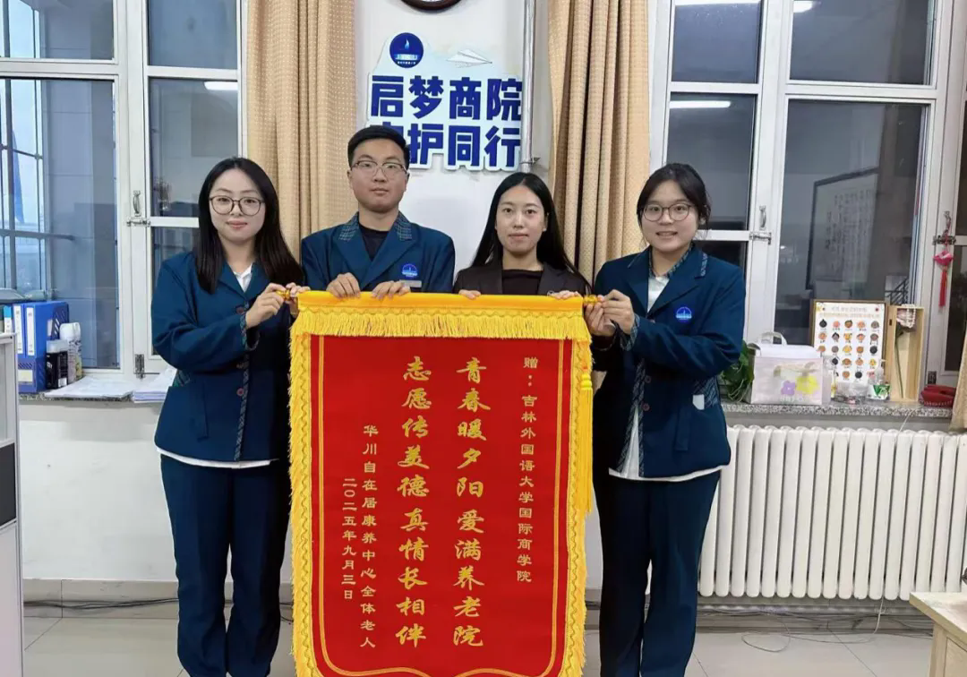 临近尾声,华川自在居康养中心负责人代表全体老人与工作人员,向国际商学院青联赠送锦旗。锦旗上“青春暖夕阳爱满养老院,青春传美德真情常相伴”的金色字迹熠熠生辉,这既是对青联同学们志愿服务的肯定,更是华川自在居康养中心对国际商学院践行社会责任、培养优秀青年学子的高度认可。